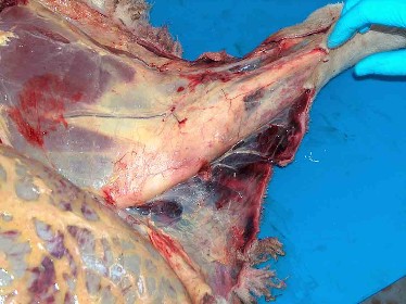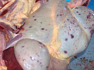 Met nadoodse ondersoek word klein bloedinkies regdeur die lewer gevind. Bloedings is ook kenmerkend in die galblaas, onder die vel en in die dermkanaal. Uiterste sorg moet gedra word met die oopsny van veral vars karkasse en dit moet liefs aan professionele persone oorgelaat word gesien in die lig van die potensiële erns van menslike infeksies en die feit dat die siekte aanmeldbaar is! Die foto's hieronder word met vergunning van die Dept Landbou, Bosbou en Visserye geplaas.
